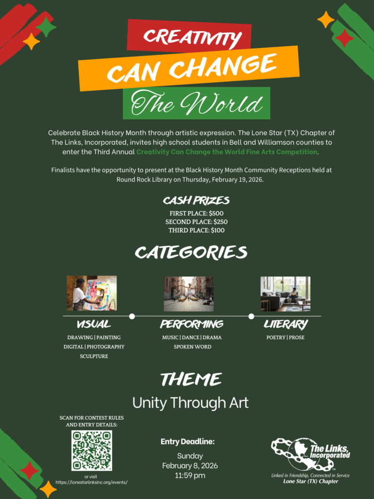 Join us in celebrating the transformative power of artistic expression by submitting your entry to the annual fine arts competition, ” Creativity Can Change the World, ” presented by The Lone Star (TX) Chapter of the Links Incorporated. This year’s theme, Unity Through Art, encourages the young voices that are shaping the future to celebrate creativity as a powerful tool for connection, dialogue, and positive change.